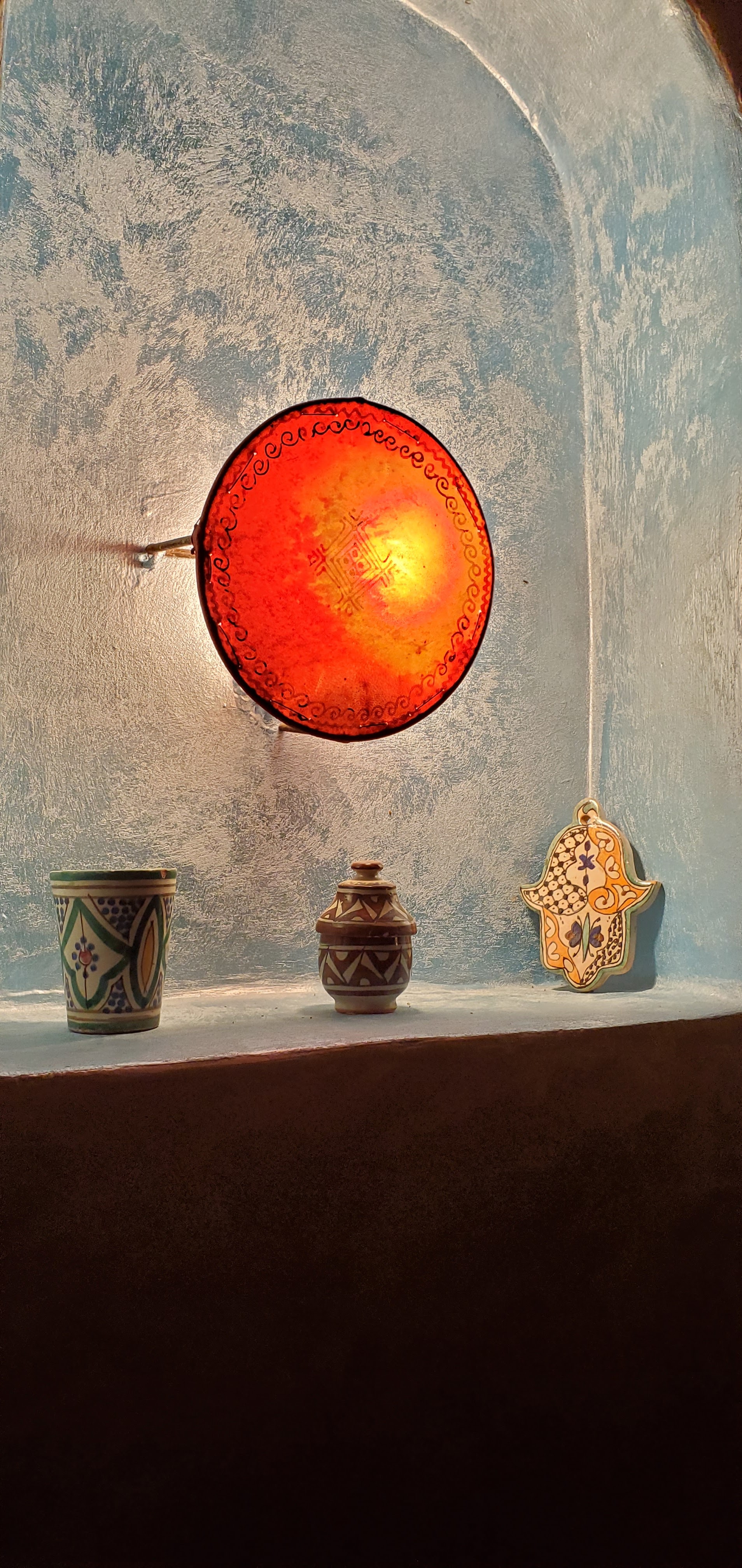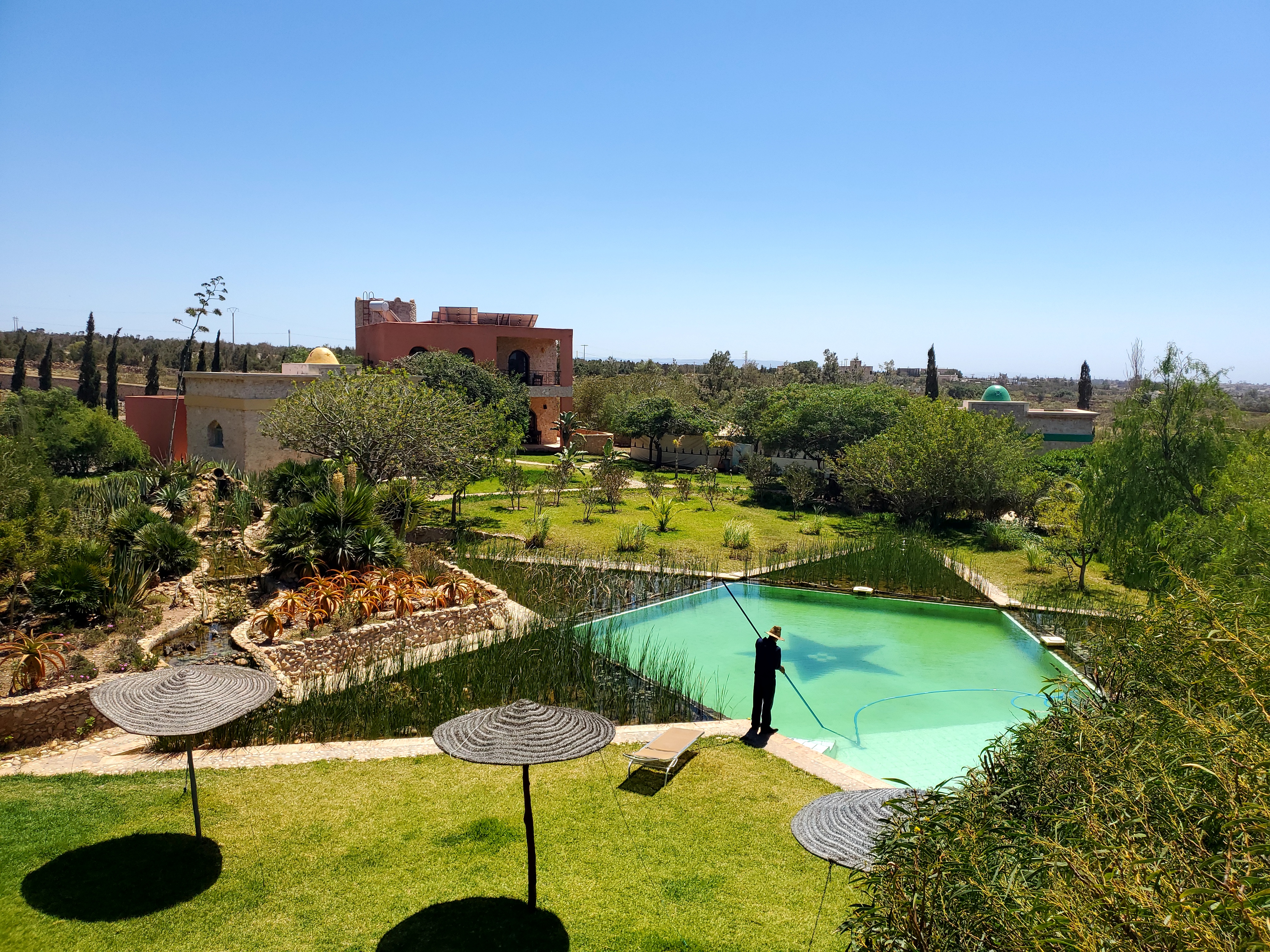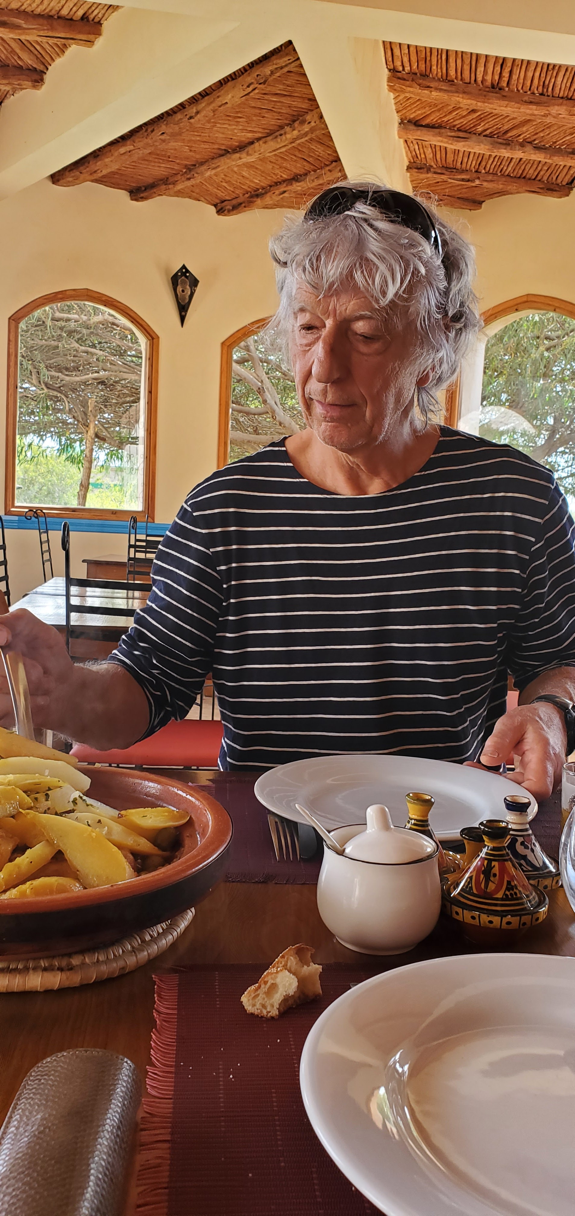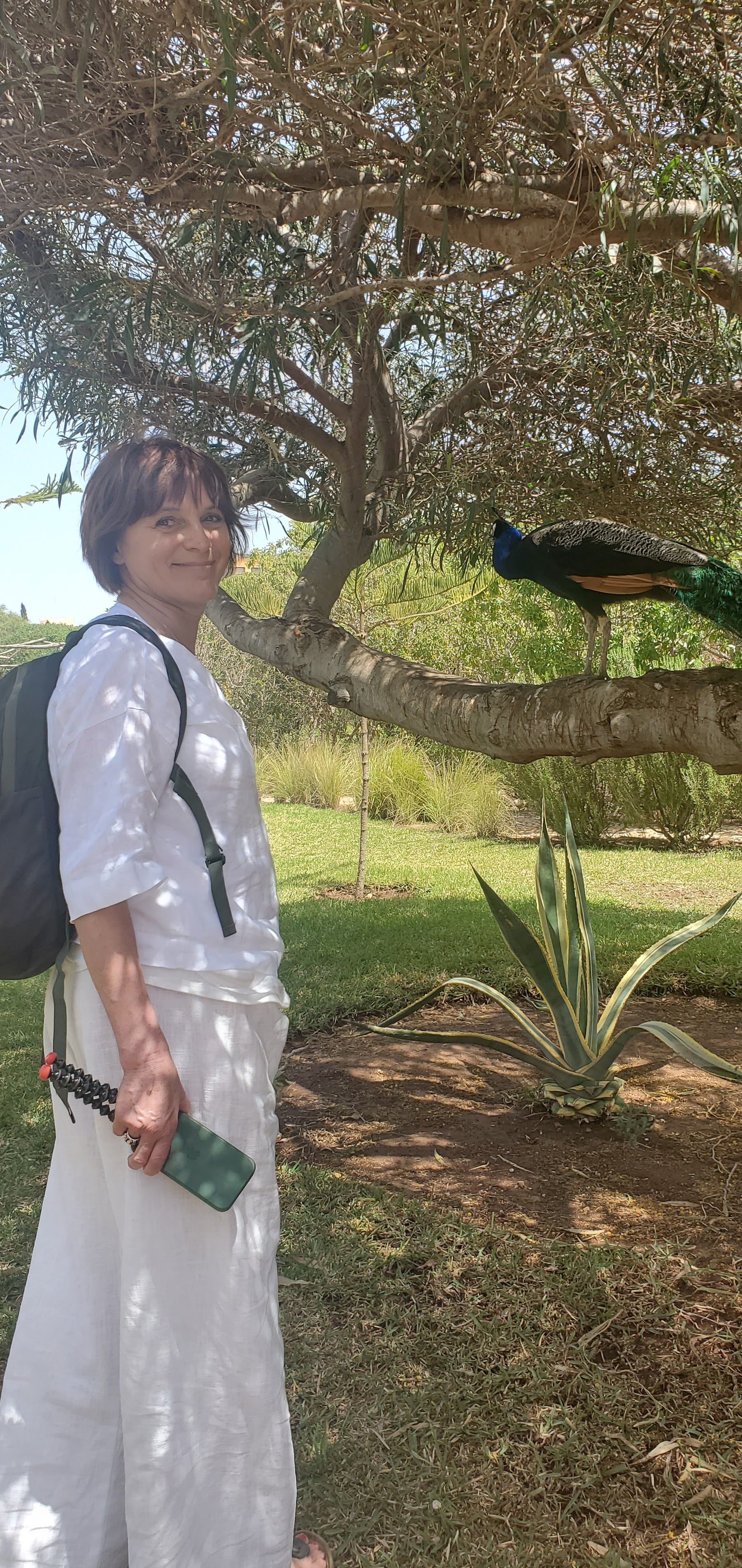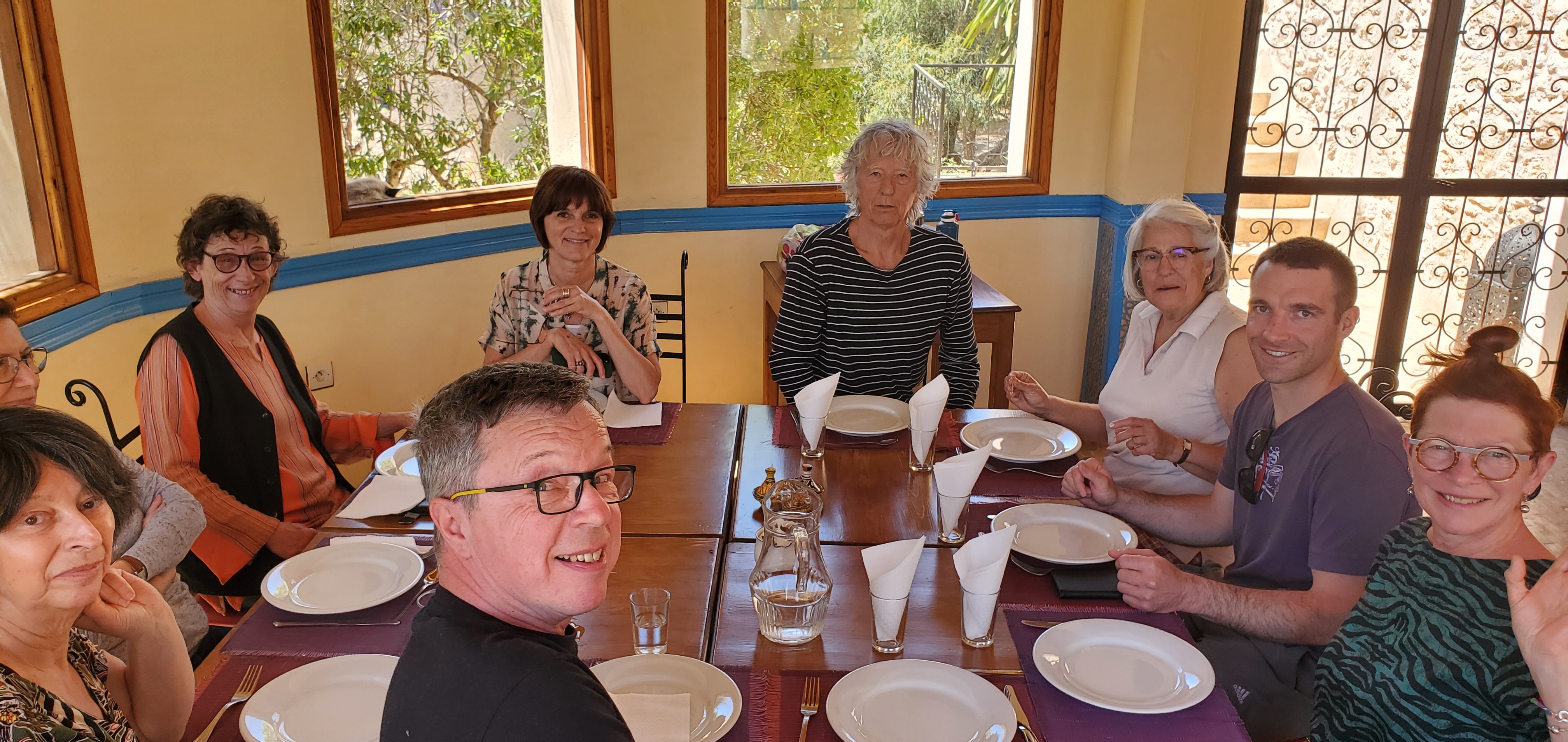 Lorsque l on est arrivé au centre Douar Noujoum, on a eu un accueil extrement chaleureux... Frédérique nous attendait ( habillée d une robe légère...)Je me suis dit oh! là...ça déjà, c est plutôt bien...vu que QQ heures plutôt on se trouvait à Bordeaux pour prendre notre avion, où il faisait que 9 °... A peine arrivé au centre que déjà Bernard nous fit assoire autour d une table, il avait prévu pour nous une excellente Tajine, du thé...Hum! Un délice pour nos papilles... Après il nous a accompagné jusque notre chambre...et là, mais quel beau jardin, l exotisme est a son comble...une telle végétation...et de plus des hibicus! Une fleur que l on n avait plus revu depuis longtemps... Une bibliothèque au rez-de-chaussée de chaussée et l escalier mènait a notre chambre...Et nous voilà, à la sime des mimosas...au loin le chant des oiseaux, le bruit de l eau qui ruisselle, le cri des paons, ...Que du bonheur... 18h Frédérique m a donné rendez vous pour mon tout premier cours en extérieur...Et là, je retrouvais ce quelque chose qui me fait du bien...le Qi Gong...et je dois dire qu en ce lieu ça était QQ chose d incroyable...un bien être...un lâcher prise, un incroyable ancrage, à méditer pour ma part plus qu important... De plus, une belle ambiance avec ce petit groupe et Frédérique comme prof mais c était Top... Roger s est bien reposé et aussi content d avoir pu découvrir ce lieu tout autour du centre...dont à 1h30 de marche pour voir et se baigner à l océan et marcher dans le sable chaud... Essaouira à 15km est à voir aussi...son immense plage, son port de pêche et ses jolis bateaux bleus...ses remparts, sa côte rocheuses ..ses superbes boutiques de beaux bijoux...d objet en bois précieux, de tapis en laine...les petits marchands de pains, de fruits et d épices... Et a midi il nous fallait trouver un restaurant avec une superbe vue sur la mer recommandé par Bernard le Mandala où on a dégusté le bon poisson qui est arrivé tout juste à 12h30 au port...ce qui a fait que l on a eu un peu d attente...mais la patience est de mise...contrairement à la France où il n y a que des gens râleurs... Merci Frédérique pour avoir choisi Essaouira et surtout ce centre Douar Noujoum, ce lieu est magique ... Et franchement sans hésiter l année prochaine on s inscrit d office... Karine et Roger